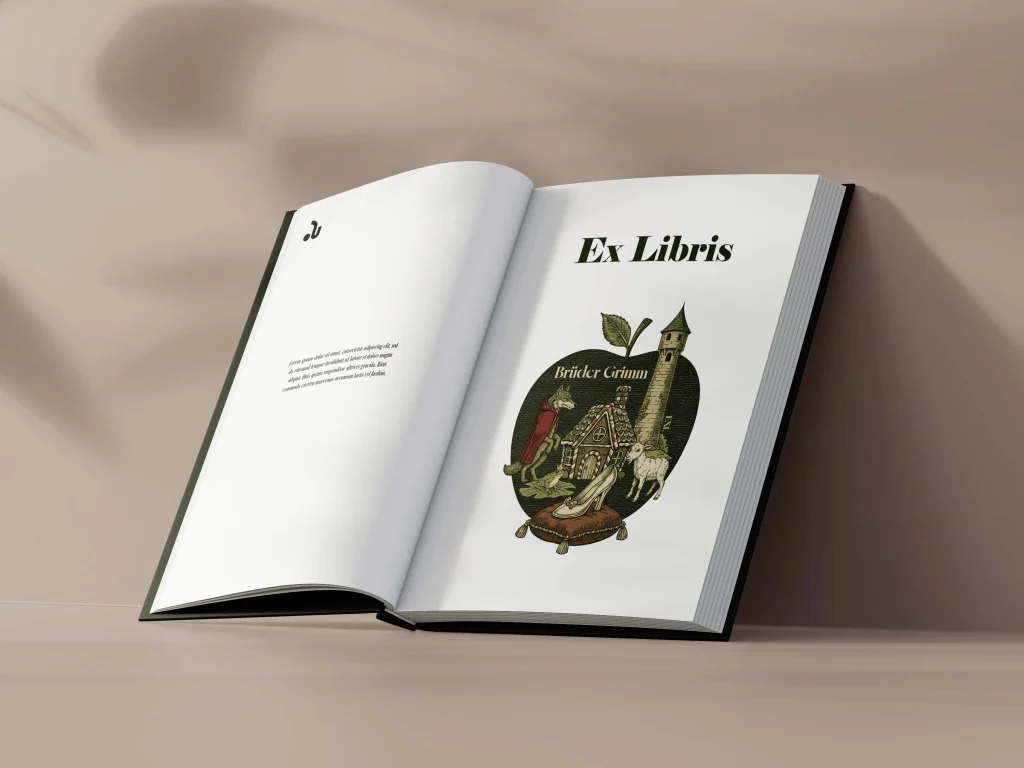 Projekt dla Braci Grimm łączy estetykę klasycznego drzeworytu z bogatą symboliką baśniową, tworząc spójną opowieść zamkniętą w jednym znaku.