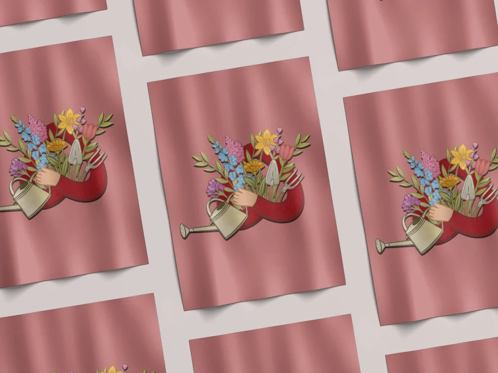 Ilustracja przedstawia kompozycję ogrodniczą umieszczoną w organicznym, czerwonym kształcie przypominającym serce lub znak nieskończoności. W centrum znajdują się: