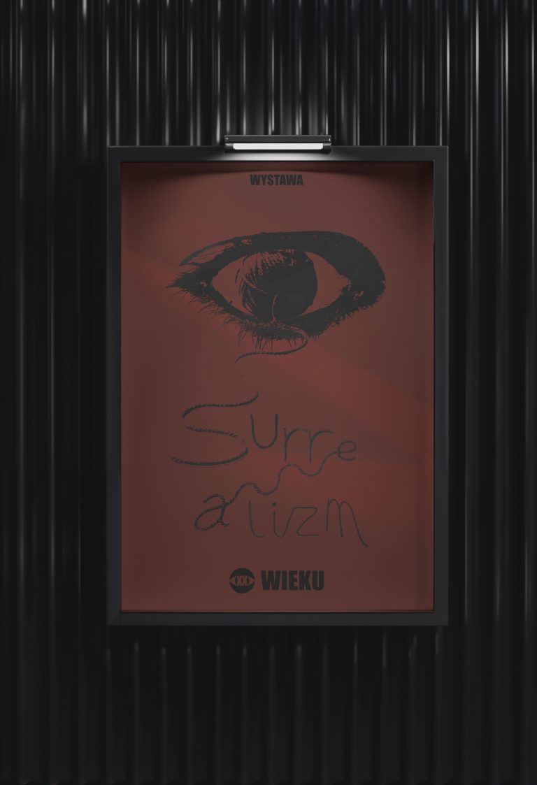 Projekt graficzny plakatu promującego wystawę „Surrealizm XX Wieku” skupia się na motywie głębi podświadomości i niepokoju wizualnego, typowego dla surrealizmu. Kolorystyka jest monochromatyczna, oparta na kontraście czerni i intensywnej, głębokiej czerwieni (burgundu), co tworzy mroczny i tajemniczy nastrój. Centralny element graficzny stanowi duże, stylizowane oko, a nazwa „Surrealizm” została zapisana nietypową, organiczną czcionką, która imituje splecione liny lub sznury, symbolizując więzy podświadomości lub iluzję rzeczywistości. Celem projektu było stworzenie intrygującego i minimalistycznego wizualnie komunikatu, który skutecznie przyciągnie uwagę i odda ducha ekspozycji.