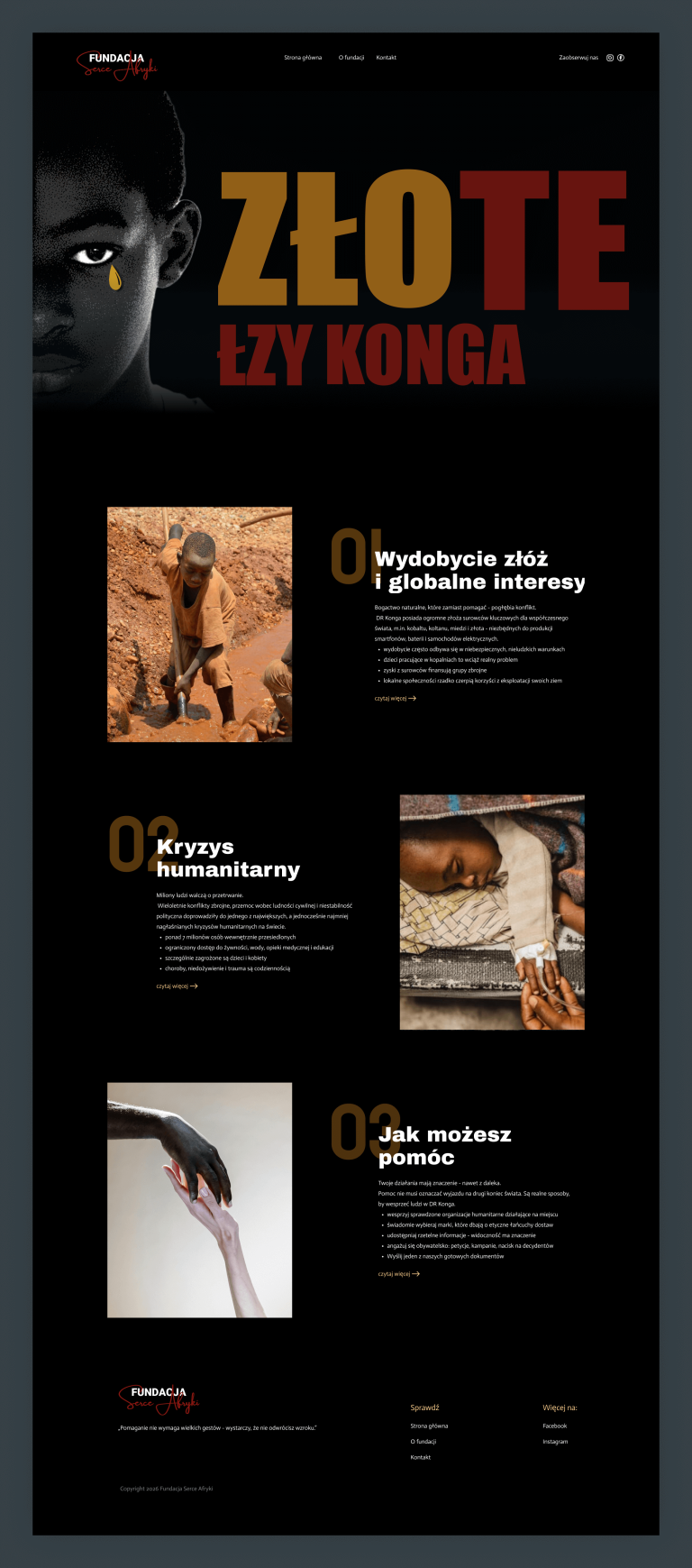 Układ strony jest czytelny i oparty na mocnych nagłówkach oraz zdjęciach dokumentalnych. Ciemne tło wzmacnia emocjonalny przekaz i spójność z identyfikacją wizualną kampanii.