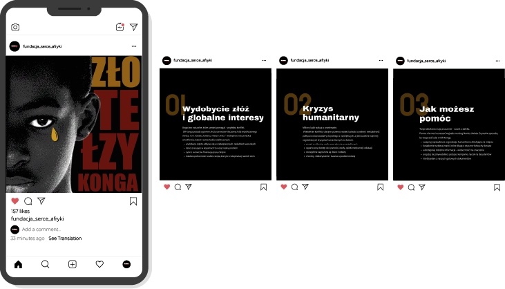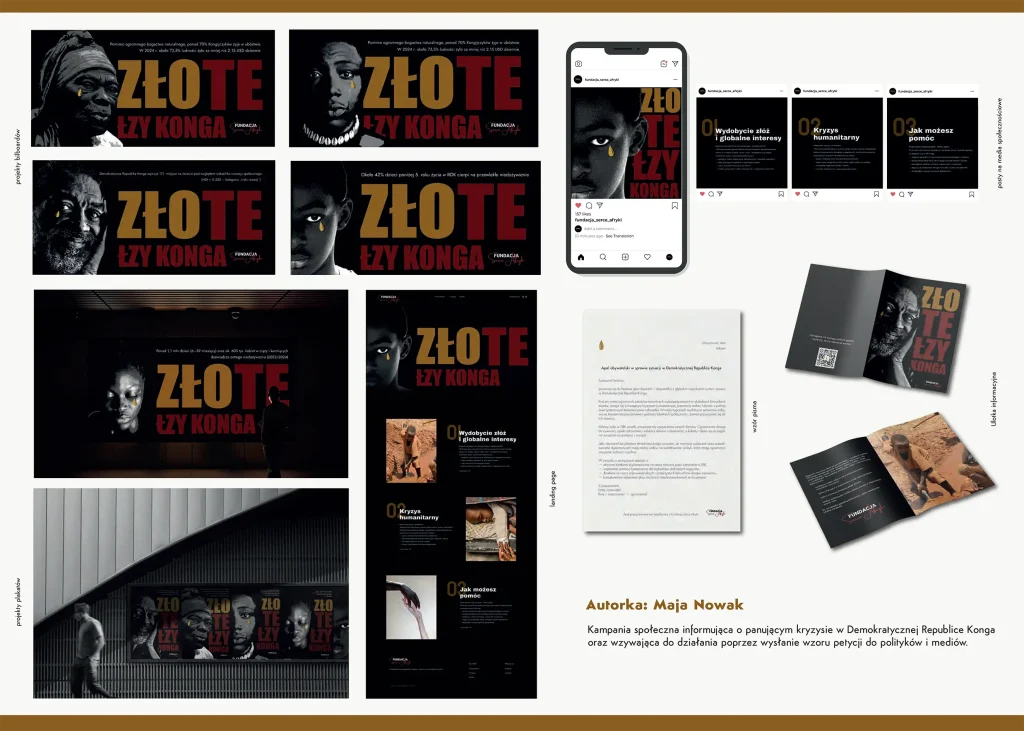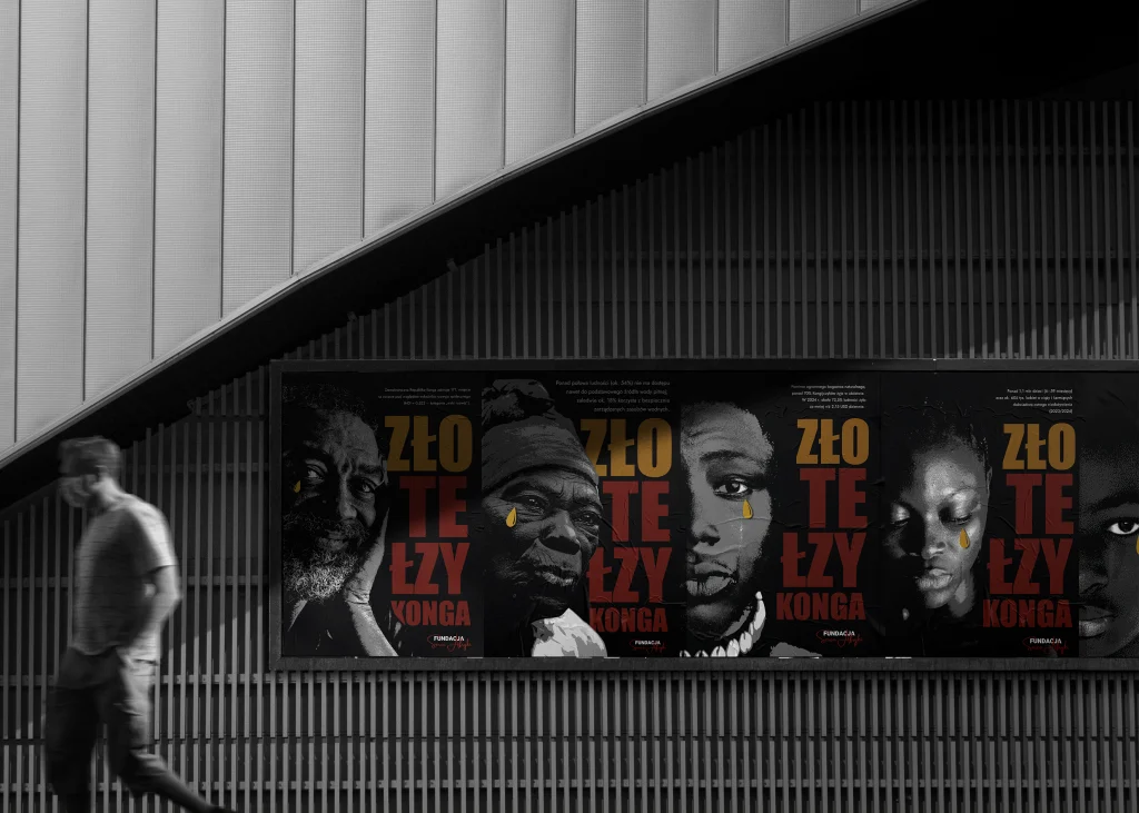 Plakaty wykorzystują duże portrety z motywem złotej łzy i wyraziste hasło. Minimalna ilość tekstu sprawia, że komunikat jest szybki i mocny. Projekt dobrze działa w przestrzeni miejskiej – przyciąga uwagę kontrastem i prostotą.