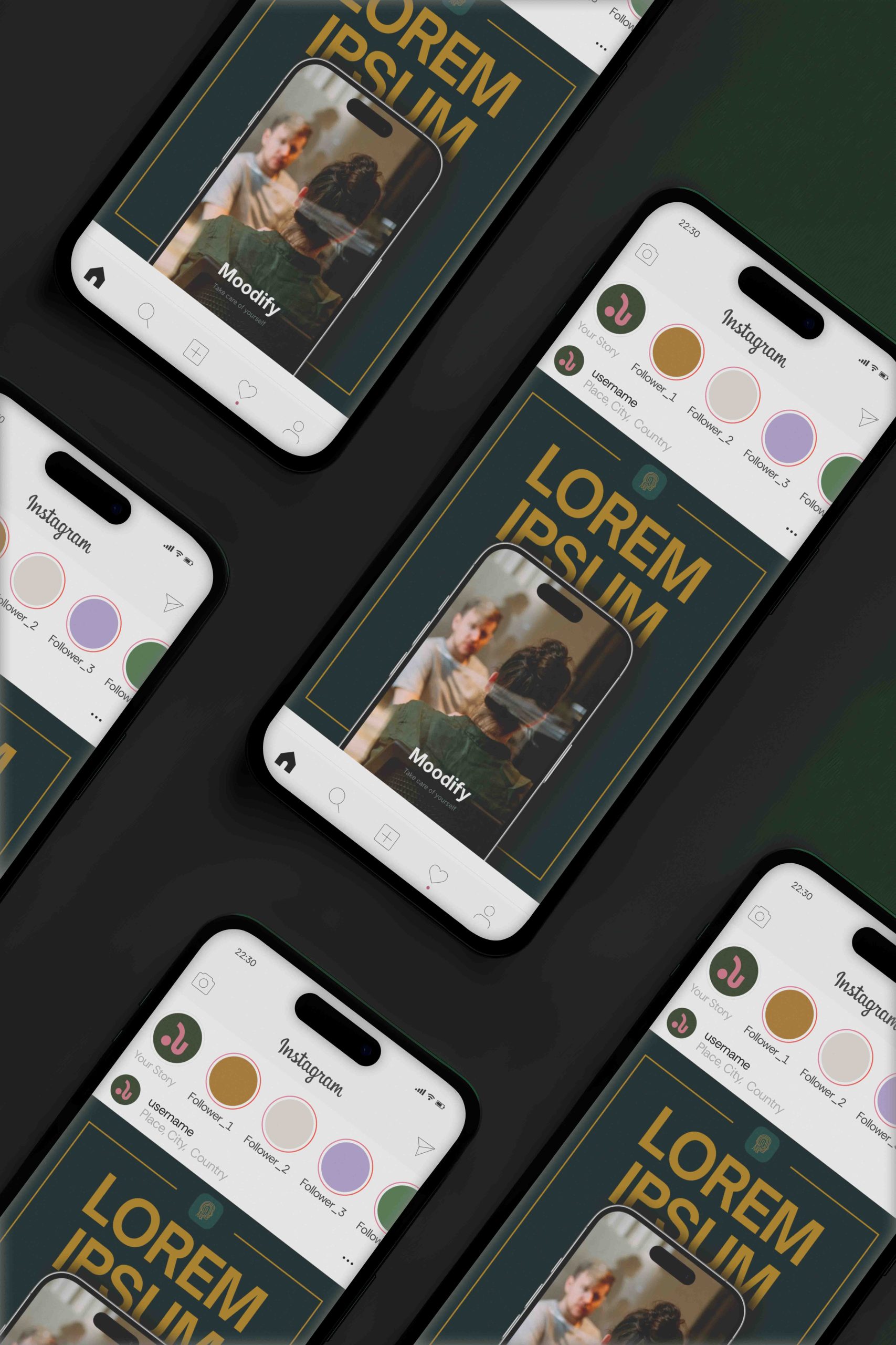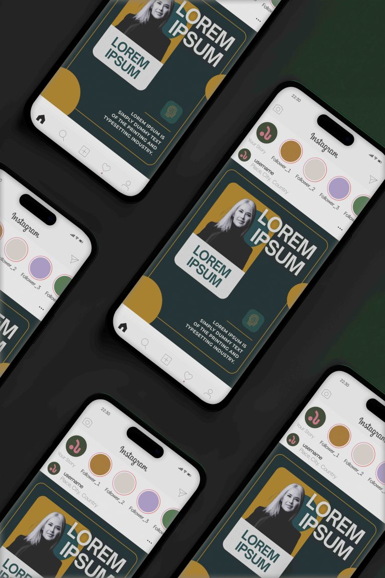 W ramach współpracy z marką Moodify przygotowałyśmy spójny zestaw szablonów na Instagram, zaprojektowany w oparciu o ich paletę kolorów: eleganckie złoto, głęboka zieleń oraz jasny, beżowy odcień. Layouty zostały stworzone tak, aby podkreślać charakter marki – luksusowy, spokojny i harmonijny – oraz ułatwiać tworzenie estetycznych, konsekwentnych publikacji w mediach społecznościowych.