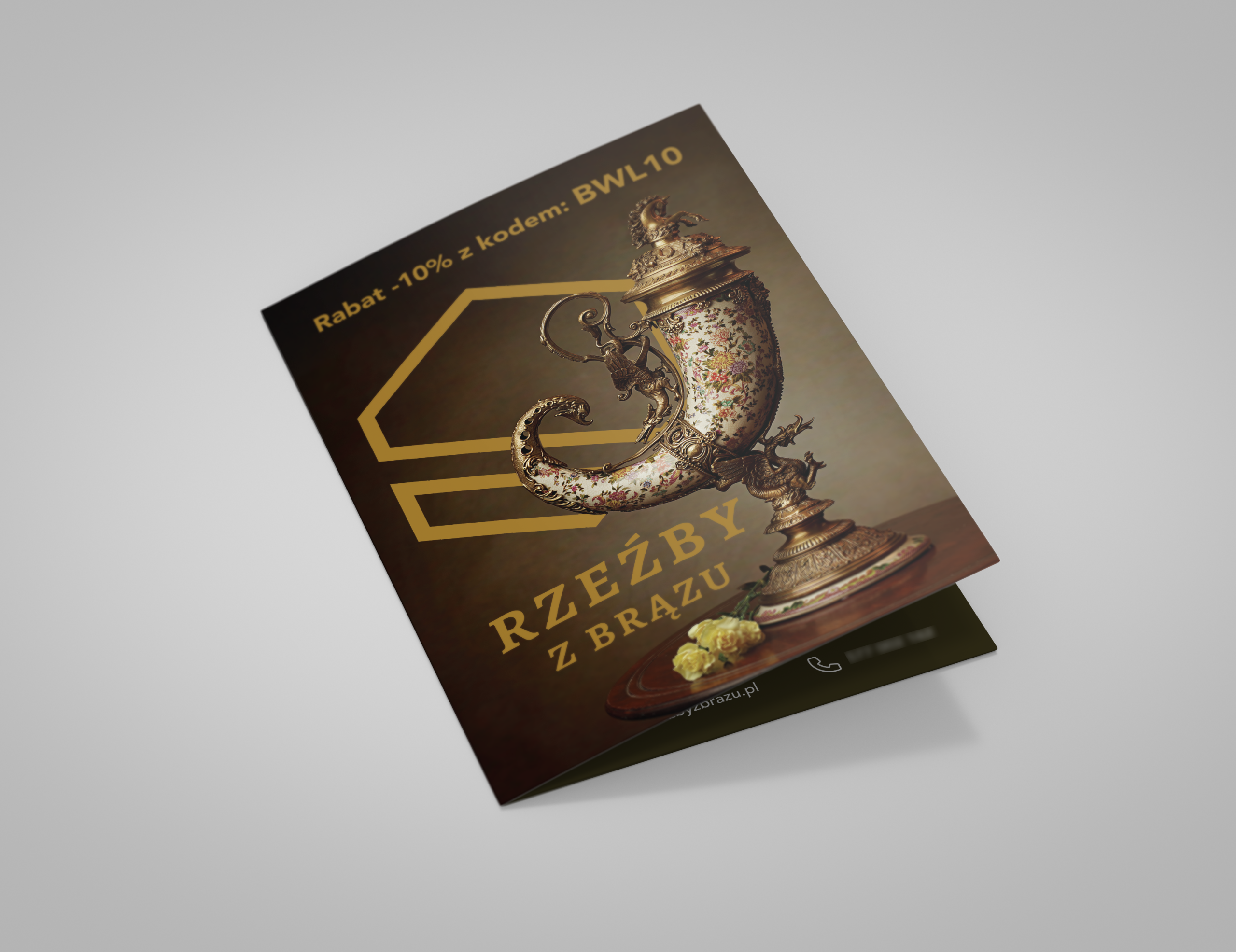 lotka, zaprojektowana z myślą o promocji eleganckich rzeźb z brązu. Głównym akcentem kompozycji jest zdjęcie bogato zdobionego rogu, który natychmiast przyciąga wzrok. Całość dopełniają złote akcenty typograficzne zestawione z ciemnym tłem, nadając projektowi klasy. Ulotka jest czytelna, a jednocześnie utrzymana w stylu, który buduje skojarzenie z rzemiosłem artystycznym.